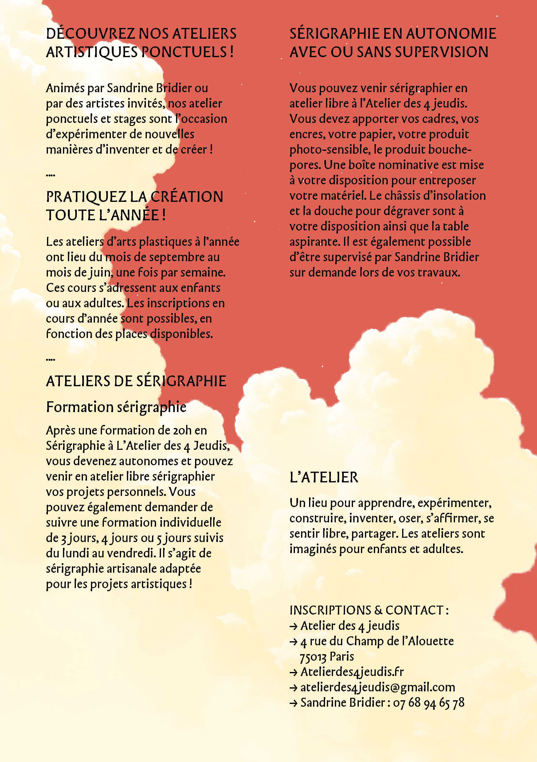 Flyer réalisé pour la saison 2025-2026 de l'Atelier des 4 Jeudis (13e arr).